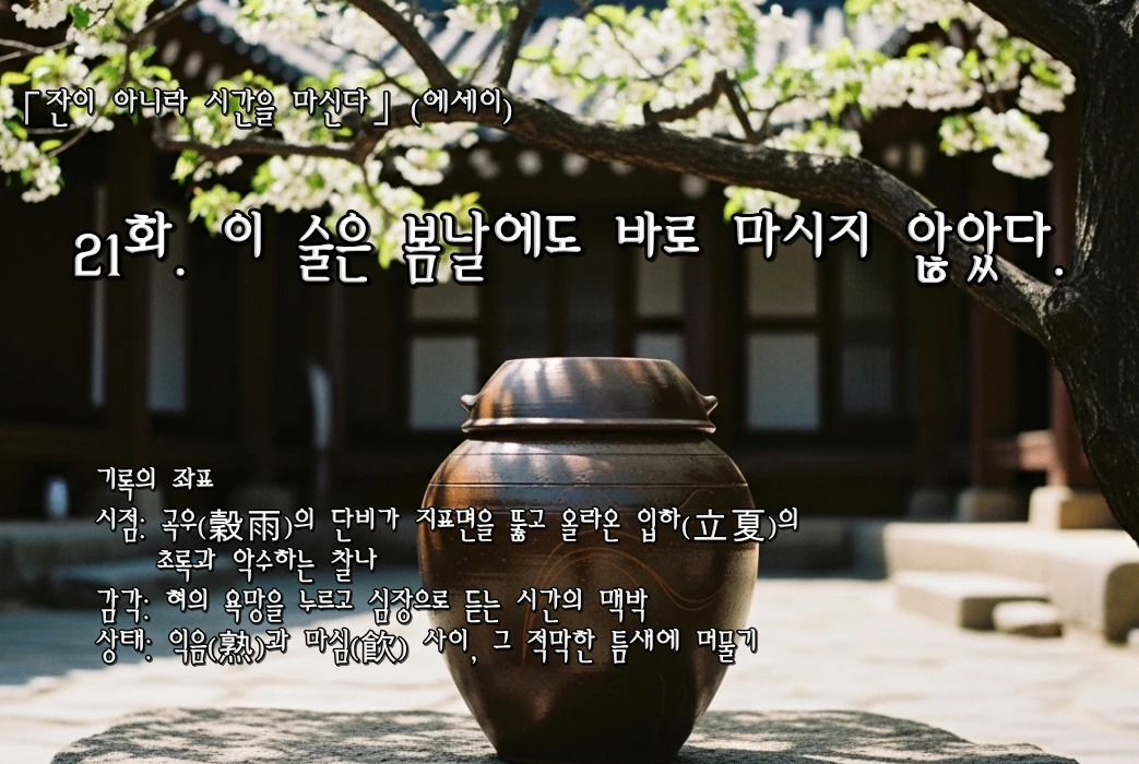 잔을 들기 전까지의 그 고독한 기다림이 술의 운명을 결정짓듯, 우리 삶의 봄날도 조금은 더디게 흘러가도 좋지 않을까요. 서둘러 삼켜버리지 않아도 봄은 우리를 배신하지 않습니다. 오히려 우리가 멈춰 서서 지켜봐 줄 때, 봄은 더 깊고 지극한 향기로 우리 생의 가장 낮은 곳까지 머물러 줄 것입니다.